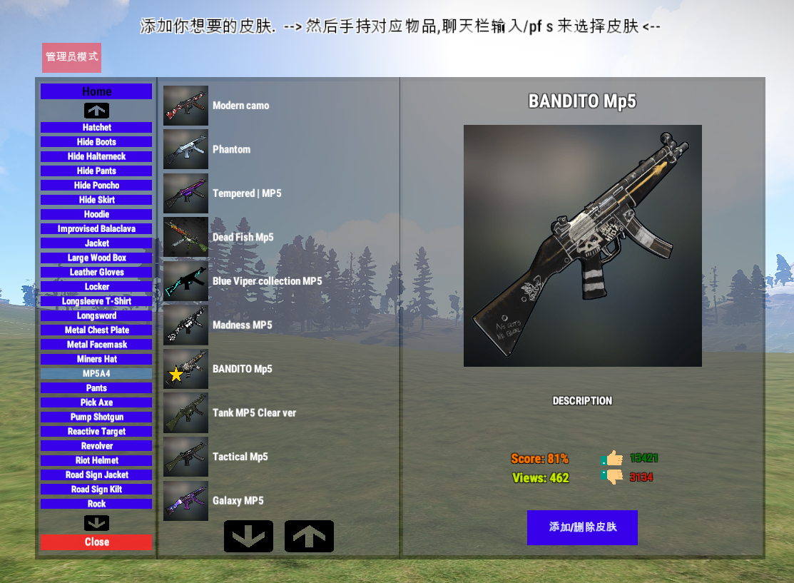 聊天栏输入 /pf s 打开选择器,找到你想要的皮肤点击添加皮肤