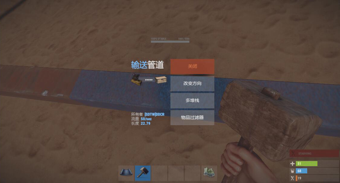 使用木锤敲击管道,查看/更改管道的流量、流向、所有者和过滤物品。